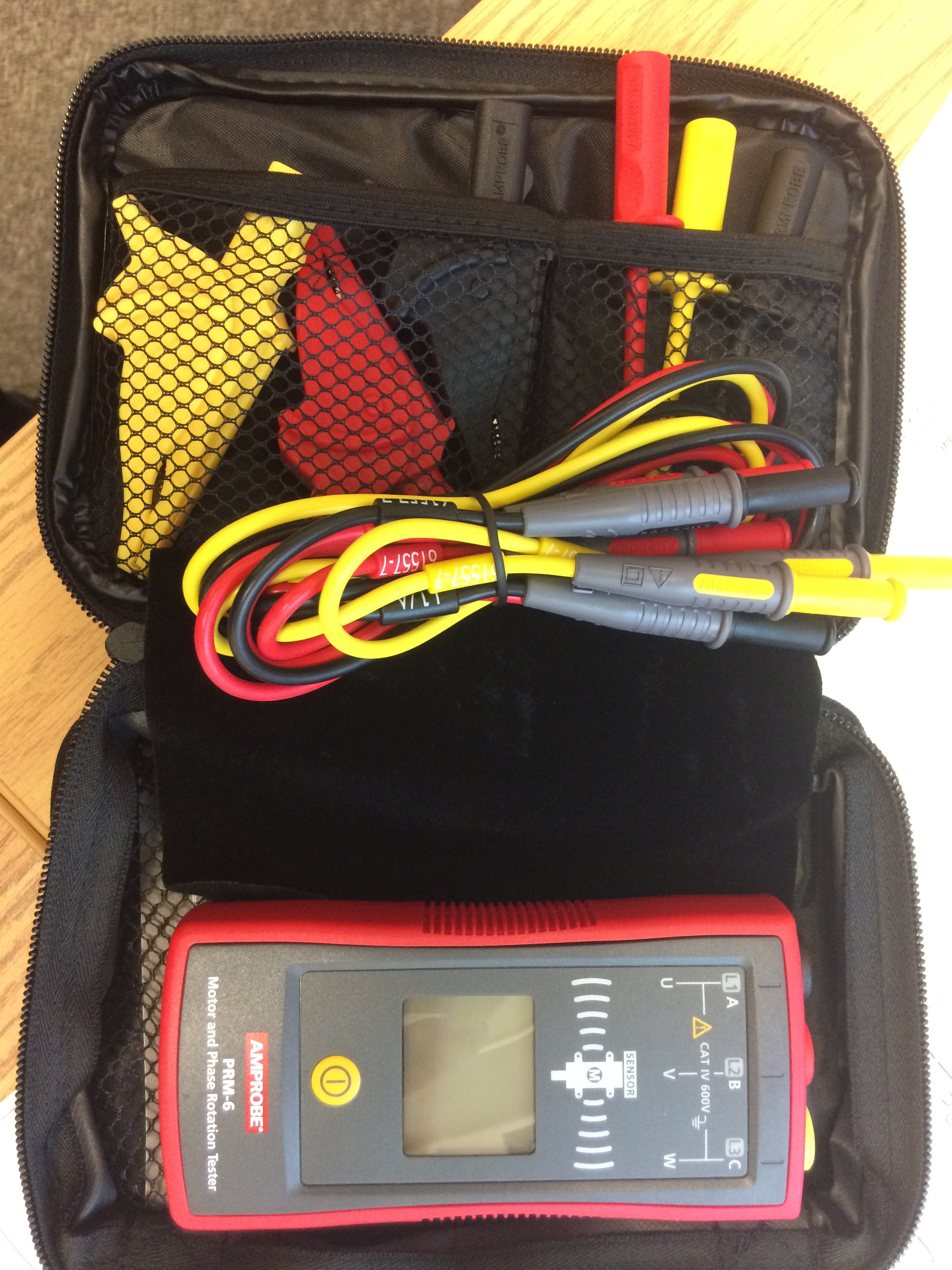 The PRM-6 Motor and Phase Rotation Tester can test the motor rotation of 3-phase systems, and verify 3-phase receptacle wiring and phase sequencing with test leads.